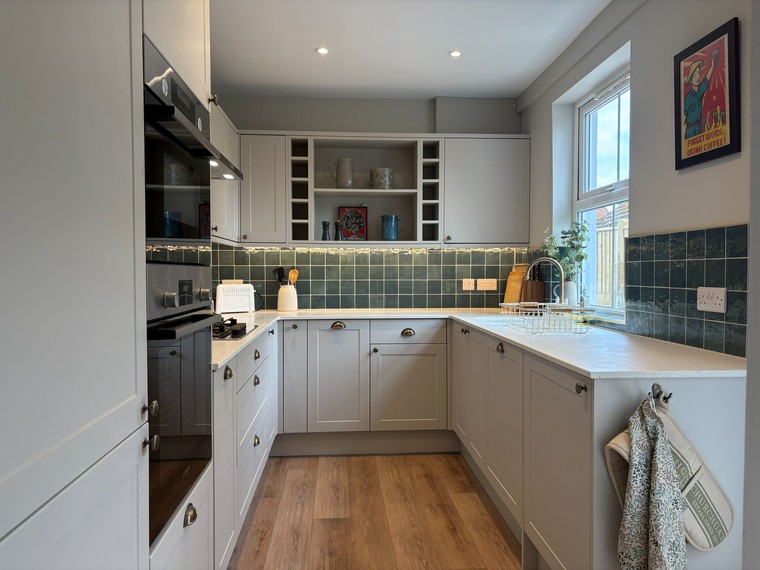 The well-equipped kitchen includes a gas hob, double oven (one of which is a microwave oven), fridge-freezer and a washer dryer. The tranquil living area includes a smart TV and seating at one end, with a dining table at the other. Step outside from your kitchen and living room to discover your own private sun-trap back garden, a peaceful spot for morning coffee, lazy afternoons, or an evening drink after a day exploring the coast.